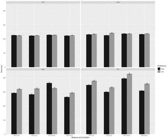 Figure 1 and Figure 2 present the descriptive statistics for different eye movement measures. A linear mixed-effects model was employed to analyze the data of the four eye movement measures at the critical pronoun and critical region, focusing on the effects of verb bias, congruency, L2 proficiency, and their interactions. The results of the detailed statistical analysis are as follows.