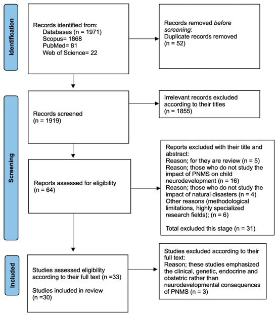 Searches were conducted between May and September 2024 on PubMed, Web of Science, and Scopus databases by 2 independent searchers (S.Y. and G.Ü.-B.). The search strategy included keywords related to natural disasters, prenatal maternal stress, and child neurodevelopment. The search terms used on the databases were as follows: (“natural disasters” OR “disasters” OR “earthquake” OR “flood” OR “tornado” OR “hurricane” OR “storm” AND “prenatal maternal stress” OR “antenatal stress” OR “maternal stress” OR “pregnancy” OR “prenatal exposure delayed effects” AND “neurodevelopment disorders” OR “language development” OR “motor development “OR “cognitive development” OR “adhd” OR “autism spectrum disorder” AND “children” OR “offspring” OR “adolescents”). A total amount of 1971 records were identified. After full-text review, 30 articles met the inclusion criteria.