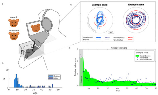 Experimental task. (a) Participants were presented with a picture of a noseless bear on a laptop monitor. Their instruction was to give the bear a nose by drawing a circle of a correct size on a drawing tablet next to the laptop. Circles were drawn without visual feedback of the hand and drawing trajectory. After each trial, binary reward feedback was provided by means of a happy or sad bear face and a bell or buzzer sound. (b) Histogram of the ages in our study population. (c) Examples of circles drawn by one of the children and one of the adults. The first and the last five attempts are shown, as well as a circle with the individual baseline radius (dashed circle) and one with the target radius (solid circle), which was set to twice the baseline radius. (d) Trials were adaptively rewarded if errors were smaller than the fifth-sized error of the past ten trials. This was done to keep the reward frequency close to 50%.