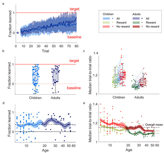 Learning and variability during the task. (a) Fraction learned over trials. Plotted are the median and interquartile range over the participants. (b) Final fraction learned per age group. (c) Variability following rewarded (signaling success) and non-rewarded (signaling failure) trials, expressed as the median trial-to-trial ratio in the radii. (d) Final fraction learned as a function of age. Note that age has been plotted on a logarithmic scale. For visualization purposes, we computed smoothed curves of the development of learning as a function of log-transformed age by calculating weighted averages using a moving Gaussian with a standard deviation of log(1.1) for defining weights of data points centered around each log-transformed year of age [33]). (e) Variability following success (in grayscale print: lighter gray) and following failure (in grayscale print: darker gray) as a function of age. Same method as panel (d). In all panels, dots indicate individual participants.