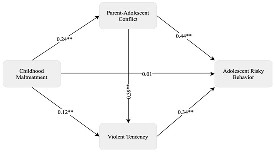 Serial mediation analyses were conducted to determine whether parent–adolescent conflict and violent tendency mediated the association between childhood maltreatment experiences and adolescent risky behavior and whether parent–adolescent conflict mediated the association between childhood maltreatment experiences and violent tendencies in adolescents. Firstly, it was found that childhood maltreatment significantly predicted adolescent risky behavior (β = 0.20, p < 0.001). Also, childhood maltreatment had a significant and positive effect on parent–adolescent conflict (β = 0.24, p < 0.001) and violent tendencies (β = 0.12, p < 0.001), accounting for 7% of the variance in parent–adolescent conflict, as shown in Table 2.