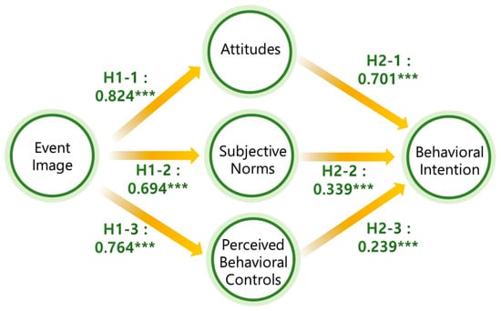 We tested the proposed relationships using SEM, and all fit indices indicated a well-fitting model (χ²/df = 2.604, CFI = 0.934, RMSEA = 0.073). The analysis confirmed significant positive relationships between event image and attitudes (β = 0.824, p < 0.001), subjective norms (β = 0.694, p < 0.001), and PBC (β = 0.764, p < 0.001). Similarly, attitudes (β = 0.701, p < 0.001), subjective norms (β = 0.339, p < 0.001), and PBC (β = 0.239, p < 0.001) all significantly influenced behavioral intention. See Figure 2 for a detailed presentation of the results.