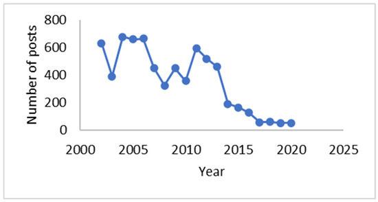 Figure 1. It is evident that the number of posts has been decreasing since 2012 and that there have been less than 100 posts per year since 2017.