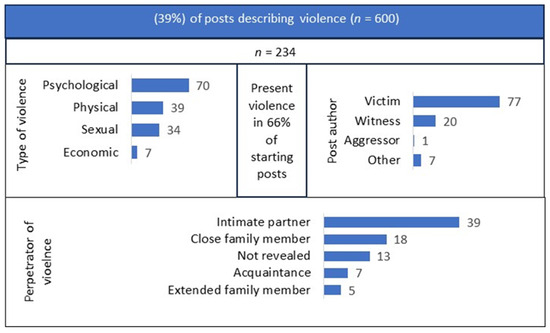 There were 234 (39%; 95% CI: 35–43%) starting posts describing violence, among which 154 (66%; 95% CI: 60–72%) described the present situation (