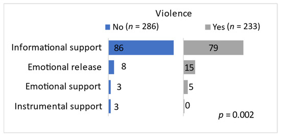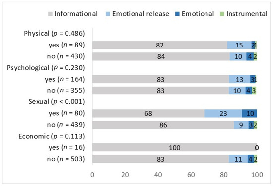 Figure 4. The share of participants describing sexual violence who sought informational support was smaller than the share of participants not describing this type of violence, while authors of posts describing economic violence were solely looking for informational support. Only authors describing physical or psychological violence sought instrumental support. The difference in the type of support authors were looking for according to the violence described in the post was statistically significant only between those describing sexual violence in comparison to those who did not (