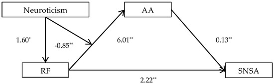 - RF as the predictor, AA as the mediator, SNSA as the criterion, and Neuroticism as the regulator, named Structure 2, moderated mediating effects see Table 3.