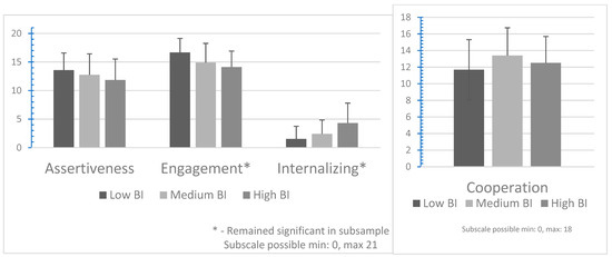 For teachers, a significant effect of BI reactivity remained on Engagement, and Internalizing Problems, with the effect on Assertion no longer reaching significance. Children in the High BI reactivity group had lower teacher-reported Engagement (p < 0.001) and higher Internalizing Problems (p < 0.001) when compared to children in the Low BI reactivity group.