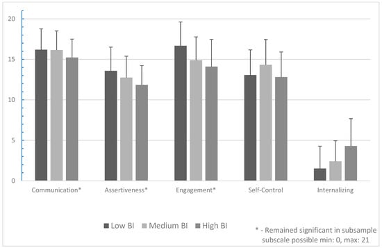 With respect to the relation of BI to social functioning, it is important to keep in mind that SC is not a unitary trait but a multi-faceted construct encompassing specific skills that enable effective responses in line with social expectations and individualistic social–emotional goals [31]. The relevance of specific aspects of SC for effective functioning (i.e., Communication, Cooperation, Assertion, Responsibility, Empathy, Engagement, and Self-Control [32]) depends on the requirements of the setting. Parents and teachers tend to focus on different aspects of SC [29] and they do not necessarily agree on which skills are most important for young children to develop. One study, for example, reported that parents and teachers agreed on only four of ten skills as the most relevant for child functioning [33]. For children with relatively high BI, some skills may be challenging in multiple settings (e.g., assertion, communication, or active engagement) and others (e.g., empathy, responsibility) may depend on the conditions in the context.