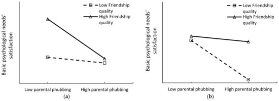 The moderating role of friendship quality may exhibit two distinct effects: reinforcement and compensation. Specifically, the reinforcement effect suggests that higher friendship quality exacerbates the negative impact of parental phubbing on adolescents’ basic psychological needs’ satisfaction. Research has indicated that high friendship quality can significantly amplify the influence of negative parent–child relationships on adolescents’ depressive moods [57]. In contrast, the compensation effect implies that friendship quality can mitigate or buffer the negative impact of parental phubbing on adolescents’ basic psychological needs’ satisfaction. Studies have shown that high friendship quality can buffer the effects of negative parent–child relationships on adolescents’ problem behaviors [58]. Accordingly, this study proposes the following two competing hypotheses to examine the moderating role of friendship quality: Hypothesis 3a (H3a): Friendship quality would positively moderate the negative relationship between parental phubbing and adolescents’ basic psychological needs’ satisfaction, meaning that higher friendship quality would strengthen this negative relationship (see Figure 1a). Hypothesis 3b (H3b): Friendship quality would negatively moderate the negative relationship between parental phubbing and adolescents’ basic psychological needs’ satisfaction, meaning that higher friendship quality would weaken this negative relationship (see Figure 1b).