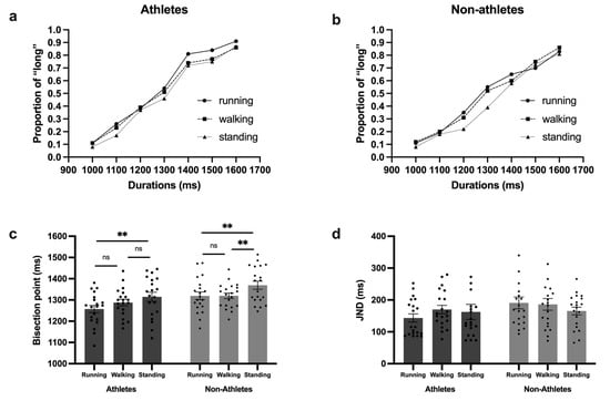 Results for the supra-second block. (a) The mean proportion of long responses of athletes; (b) the mean proportion of long responses of non-athletes; (c) the mean bisection points of athletes and non-athletes; (d) the mean JND of athletes and non-athletes. ** p < 0.01; ns: not significant.