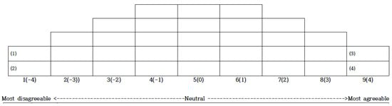 Q sorting is the organizing of individuals’ subjective views, showing the extent to which the P sample agrees or disagrees with each statement on a given topic [56]. In other words, Q sorting involves modeling the P sample’s attitude toward a specific topic or situation; it is a process of reading statements and forcibly distributing them [45,55]. Thus, Q sorting involves ranking and classifying statements according to the P sample’s perspective.