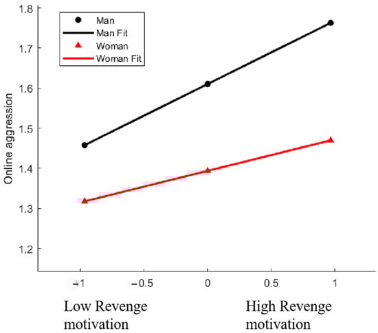 The findings reveal that gender significantly moderates the relationship between revenge motivation and online aggression (β = −0.079, 95% CI = [−0.143, −0.015], p < 0.05). A simple slope analysis (see Figure 4) indicated that, for individuals with high levels of revenge motivation, gender significantly predicts online aggression (βsimple = 0.158, p < 0.001). This relationship remains significant for individuals with low levels of revenge motivation as well (βsimple = 0.079, p < 0.001).