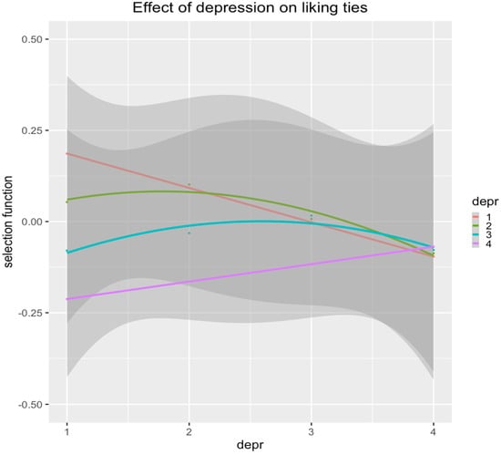 Liking-ties selection of adolescents’ (ego) on peers (alter) based on levels of depressive symptoms. Note. The selection function indicates the preference for selecting liked peers combining ego and alter depressive-symptom levels (x-axis, and curve colors, respectively). The values of ego and alter represent null (1), low (2), moderate (3), and high (4) values of depressive symptoms.