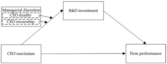 More recently, researchers have begun investigating the influence of CEO narcissism on firm performance. Some scholars have pointed out that CEO narcissism can positively impact firm performance [44]. Narcissistic CEOs often enhance sustainability accounting and performance by engaging in real activities, such as promoting corporate social responsibility initiatives and adjusting sales management strategy [43]. Conversely, other scholars contend that CEO narcissism negatively influences firm performance [8]. Highly narcissistic CEOs tend to overestimate the value of the target and, hence, are willing to pay a higher M&A premium [45]. This behavior may result in suboptimal investments, ultimately diminishing the firm’s performance. Furthermore, these CEOs are more likely to pursue risky projects while neglecting core business operations, a tendency that can reduce investor confidence and result in lower firm valuations. Meanwhile, some scholars found that firm business performance is not influenced by the degree of CEOs’ narcissism [46]. Evidence shows that the relationship between CEO narcissism and firm value remains ambiguous. Additionally, scholars have begun to examine how CEO narcissism affects a firm’s R&D investment. Evidence suggests that narcissistic CEOs are particularly prone to invest in R&D expenditures [41]. Narcissistic CEOs desire to exhibit superiority and reaffirm their self-image, and risky bold moves offer a publicly visible route for pursuing R&D activities [42]. However, other researchers indicate a negative relationship between CEO narcissism and corporate R&D investment [47]. The narcissistic CEO’s ambition to rapidly expand the company and build a “business empire” often comes at the expense of R&D expenditures. These studies provide better evidence to understand the relationship between CEO narcissism, R&D investment, and firm performance. However, the existing literature has largely overlooked the mediating effect of R&D investment in the relationship between CEO narcissism and firm performance in Confucian cultural contexts, and neglected the moderating role of managerial discretion in the relationship between CEO narcissism and R&D investment. Therefore, this study aims to empirically examine three pivotal research questions. First, we investigate the influence of CEO narcissism on R&D investment and firm performance. Second, we analyze the mediating effect of R&D investment on the relationship between CEO narcissism and firm performance. Lastly, we evaluate the moderating role of managerial discretion in the link between CEO narcissism and R&D investment.