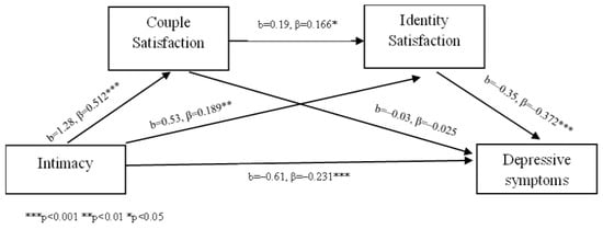 An examination of indirect effects (Table 3) showed evidence of both simple and serial mediation effects linking intimacy to depressive symptoms. The total indirect effect through couple satisfaction, intimacy, and identity satisfaction was significant (β = −0.30, 95% CI [−0.51, −0.10]) (Figure 3).