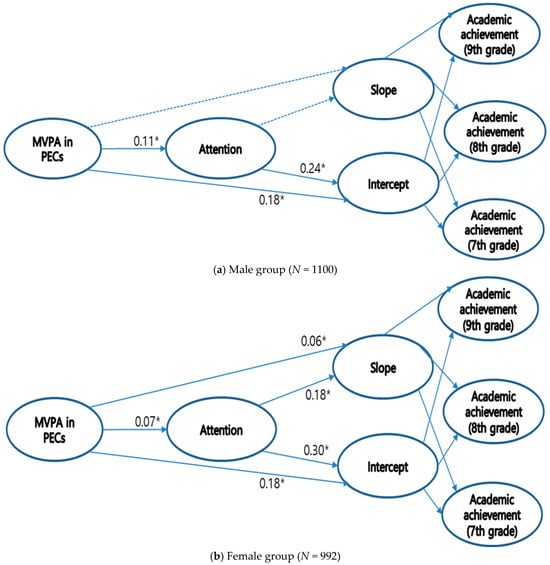 Third, for girls, study findings showed that MVPA in PECs had both direct and indirect effects on initial academic achievement (7th grade) through attention and on the slope of academic achievement (7th through 9th grade). These findings align with previous studies in that the greater intensity of PA leads to higher academic achievement for girls and not for boys [50,51]. The difference in our findings between genders may be explained by physiological and psychological mechanisms. Adolescent girls have lower fitness levels [52,53] and lower self-esteem than adolescent boys [54,55]. Therefore, these variables can cause differences in the relationship between PA and academic achievement. This might explain that MVPA in PEC can positively influence educational outcomes and psychological domains, and these effects may vary across gender groups. Extant research suggests that psychological factors (i.e., self-esteem and depression) are associated with PA and academic achievement [56,57]. Therefore, these potential confounding variables should be considered in future studies so that gender-specific prevention programming can be implemented in school settings.