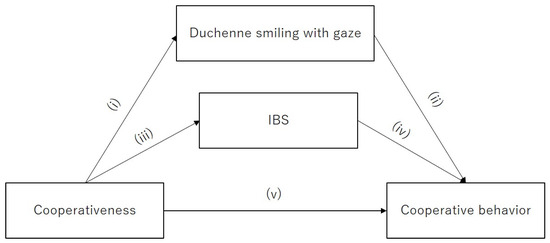 Hypothetical model. The hypotheses are demonstrated as the following: (i) cooperativeness predicts Duchenne smiling with gaze; (ii) Duchenne smiling with gaze predicts cooperative behavior; (iii) cooperativeness predicts IBS; (iv) IBS predicts cooperative behavior; and (v) cooperativeness predicts cooperative behavior.