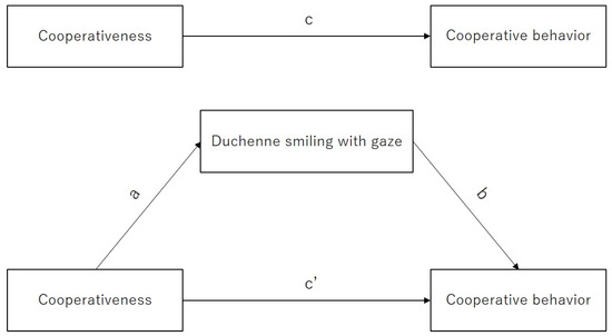 Diagram of hypothesized mediation model. Path (c) determined the total effect of cooperativeness on cooperative behavior; path (a) and (b) determined the indirect effect of cooperativeness on cooperative behavior through Duchenne smiling with gaze; and path (c′) determined the direct effect of cooperativeness on cooperative behavior.