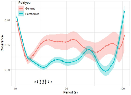 Results of two-sample t-test of coherence from genuine dyads and permutated dyads between timescale 15.48 and 21.89 s (0.04–0.06 Hz).