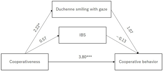 The results of path analysis are presented in Figure 5. The model demonstrated an acceptable fit (p = 0.51, CFI = 1, SRMR = 0.03) and accounted for 38% of the cooperative behavior variance. The z-values in Figure 4 clearly showed that cooperative behavior was predicted positively by cooperativeness (β = 0.64, z-value = 3.80, p < 0.001, r2 = 0.38). However, both the path from Duchenne smiling with gaze (β = 0.83, z-value = 1.07, p = 0.28, r2 = 0.12) and the path from IBS during conversation (β = −0.13, z-value = −0.13, p = 0.89, r2 = 0.01) to cooperative behavior were not significant. In addition, it showed that cooperativeness positively predicted the proportion of time Duchenne smiling with gaze occurred (β = 0.07, z-value = 2.22, p = 0.02, r2 = 0.12).