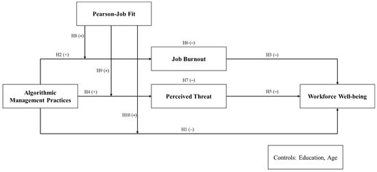 The relationships among algorithmic management practices, job burnout, perceived threat, workforce well-being, and the moderating role of person–job fit are synthesized into the proposed research model. This model visually represents the hypothesized connections and provides a framework for understanding the study’s conservation of resources theory and variables, as illustrated in Figure 1.