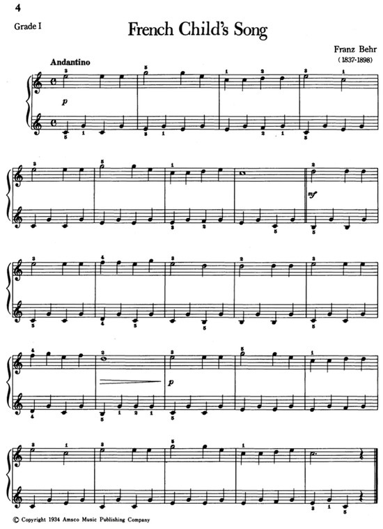 The multiple case studies were designed to investigate teaching methods that straddle both visual and auditory approaches in three ways. In Case Study 1, visual-initiated approaches were used before the auditory approach. In Case Study 2, auditory-initiated approaches were used before the visual approach. In Case Study 3, there was a blend in the use of auditory and visual approaches in learning and teaching. Each case was bound to a teaching approach designed to explore the effectiveness of the auditory teaching approaches. While the approaches varied, all participants were given Behr’s work to learn. This piece is composed in C major, 4/4 metre, with simple harmonic progression and ternary form. As shown in Figure 1, the music elements featured were simple and dotted rhythms, with dynamic markings of p, mf, and decrescendo symbols and melodic intervals of 2nds to 6ths. In terms of playing skills, the forearm-led Alberti-like accompaniment is within the penta-scale (i.e., five-finger) position for the right hand, while for the left hand, it extends out, reaching an interval of 6ths at certain points. Using these parameters, the lesson featured modality-flexible activities (e.g., echoing-back with voice or movement or percussive instrument) to work on rhythm that progresses from crotchet to semibreve before teaching dotted minim. Next, rhythm was used as a base to integrate terraced dynamics and gradient inflections before associating the notion of phrasing through contour when the song/piece was sung. The French Child Song by Franz Behr was first taught by singing the piece in a solfege system (limited to doh, re, mi, fa, soh, and ti), second, by integrating subtle phrasing and dynamics. All the participants eventually spent time learning technical skills or playing the piece. After each lesson, participants were given homework tasks to complete as part of the uptake in learning and as preparation for the next lesson.