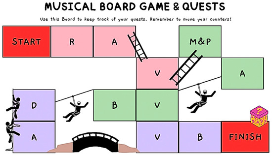 Music board game used in the game-based assessment. The abbreviations indicate the type of music element tested, Rhythm (R), Melody and Phrasing (M & P), and Dynamics (D), and through the type of modality, Auditory (A), Visual (V), and Blended Modality (B). Reprinted from [3].