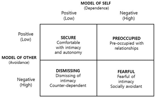 Scholars have provided different categorisations for the concept of adult attachment, which refers to the patterns of child attachment proposed by Bowlby [5] in the context of adult romantic relationships. For example, Hazan and Shaver [12] identified three types of attachment—secure, anxious, and avoidant—while Bartholomew and Horowitz [13] distinguished four types based on the dimensions of self-awareness and other awareness: secure—viewing oneself and others positively and maintaining close relationships; preoccupied—holding a negative self-view and excessively depending on others in relationships; dismissing—evaluating oneself positively but avoiding intimacy due to a lack of trust in others; and fearful—negatively assessing oneself and others, desiring close relationships while simultaneously fearing them (Figure 1) [13]. Thus, the attachment formed during adolescence, similar to the attachment relationships established with primary caregivers in childhood, also influences interpersonal relationships in adulthood.