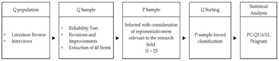 Consequently, this study uses the Q methodology to categorise perceptions of love in early adulthood and discern the meanings associated with each type. The research process involves the following steps: constructing the Q sample, assembling the Q sample from the Q population, selecting the P sample, and classifying the Q sample through the P sample, followed by data analysis. We conducted this study after receiving approval from the Dongguk University Institutional Review Board (IRB no. DUIRB202308-22) following the procedure illustrated in Figure 2.