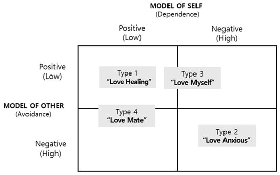 The Love Healing type comprised 11 participants with characteristics of psychological well-being, such as positive emotions, attitudes towards life, and inner growth, which allowed them to accept themselves positively and form trusting, stable relationships with their partners. These characteristics align with Bartholomew and Horowitz’s [13] ‘secure attachment type’, marked by high intimacy, comfort, and autonomy. This type corresponds to the ‘secure’ category of adult attachment styles. Individuals with secure attachment have a well-integrated sense of self-identity and high self-esteem. They also show high intimacy towards and trust in their loved ones, are open and flexible, and do not find self-disclosure difficult [12,13,67,68]. Due to their positive internal working models, these individuals consider being loved to be natural and express high satisfaction in relationships through the comfort and happiness of mutual trust. Additionally, Marrero-Quevedo and colleagues [69] reported a positive relationship between secure attachment and psychological well-being, which resonates with the characteristics of the Love Healing type.