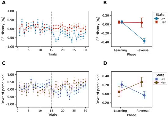The temporal flow shown in Figure 4A illustrates the significant drop in mood when the decision environment changed (at the beginning of the reversal phase) in the low-reward state. In line with this result, the perceived rewards were significantly higher () during the high-reward state (), showing the influence of mood on reward perception (see Figure 4C,D).