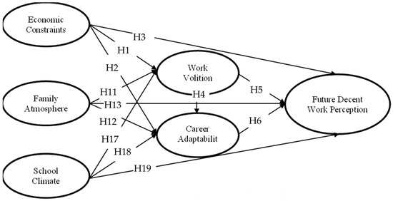 Family atmosphere refers to the family’s internal psychological process, family members’ behavior, communication, and the interaction between the family and the external environment [21,22]. Previous studies found that family atmosphere significantly affects work volition. For example, Lustig and Xu indicated that higher levels of family cohesion were associated with lower levels of decision-making confusion, which indicated that the family atmosphere might predict an individual’s effective work choices [23]. Therefore, taking into account authors Lustig and Xu, we suggest that family atmosphere significantly positively predicts work volition (Hypothesis 11). Additionally, some researchers found that family atmosphere significantly affected career adaptability. For instance, Zhao found that students living in a harmonious family atmosphere had the highest level of career adaptation, while students living in a frequently quarreling family atmosphere had the lowest level of adaptation [24]. Based on author Zhao, we suggest that family atmosphere positively predicts career adaptability (Hypothesis 12). Based on the findings of Wang et al. that family support can relieve personal stress so that individuals can have more energy to devote to their work [25], we suggest that family atmosphere significantly positively predicts future decent work perception (Hypothesis 13). In conjunction with the previous discussion regarding the relationships between family atmosphere, work volition, career adaptability, and future decent work perception, we assume that work volition mediates the association between family atmosphere and career adaptability (Hypothesis 14), as well as the association between family atmosphere and future decent work perception (Hypothesis 15), and that career adaptability mediates the association between family atmosphere and future decent work perception (Hypothesis 16).