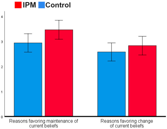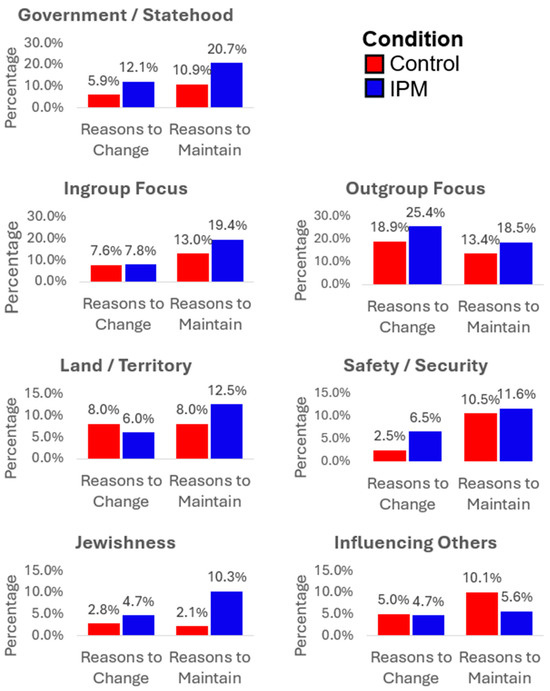 Among the remaining themes, Land/Territory was more likely to be mentioned as a reason to maintain existing beliefs in the IPM condition (χ2 = 5.77, df = 1, p = 0.016); influencing other people’s opinions was more often mentioned as a reason to maintain attitudes and beliefs in the control condition (χ2 = 4.33, df = 1, p = 0.038); outgroup-focused reasoning was more likely a reason for change in the control group and for maintaining in the IPM condition (χ2 = 5.80, df = 1, p = 0.016); ingroup-focused reasoning was more likely mentioned as a reason for maintaining attitudes and beliefs in both the IPM condition (χ2 = 13.40, df = 1, p < 0.000) and the control condition (χ2 = 3.85, df = 1, p = 0.050), but even more so in the IPM condition than in the control condition (χ2 = 16.22, df = 1, p < 0.00; see Figure 3). The remaining differences between conditions were not significant.