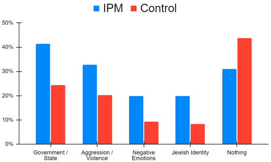 We wanted to determine if participants’ considerations for changing or maintaining existing attitudes and beliefs were affected by the IPM-based intervention. Since there were more responses from the IPM condition, we first controlled for response count by dummy coding each theme, where participants were given a “1” if the theme was present in any of their responses, and a “0” if the theme was not present in any of their responses. We then conducted chi-square tests to determine whether the prevalence of themes differed between experimental conditions. Participants in the IPM condition more often referenced the themes of Government/Statehood, Jewish Identity, Aggression/Violence, and Negative Emotions than participants in the control group (see Table S3) (For an additional method of measuring the effects of the IPM-based intervention on participant decisional balance, where participant responses are measured by the number of coded themes in each response out of their total amount of thematic codes, see Table S4. Results from this additional method were largely similar to those reported here). The only theme that was more prevalent among control group participants was responses that conveyed participants not having any considerations for changing and/or maintaining their current attitudes and beliefs (e.g., “Nothing”). In most of these cases, there were no statistically significant thematic differences across reasons for changing or maintaining existing attitudes and beliefs, except for two cases: Jewish Identity was more likely to be mentioned in the IPM condition as a reason to maintain existing attitudes and beliefs (χ2 = 5.22, df = 1, p = 0.035); and the Government/Statehood theme was both more prevalent in participant responses in the IPM condition (χ2 = 6.29, df = 1, p = 0.017), as well as more often mentioned as a reason to maintain existing attitudes and beliefs (χ2 = 10.07, df = 1, p = 0.002; See Figure 2; for thematic examples of responses for changing or maintaining beliefs, see Table S5).