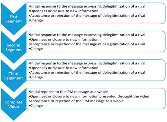 To understand the significance of the collected data, the findings from each interview were meticulously read and analyzed. The data were then organized separately and specifically according to each segment (i.e., the three segments and the segment where the entire video was shown). Each interview was analyzed according to the elements of the IPM (see Figure 4) as follows: