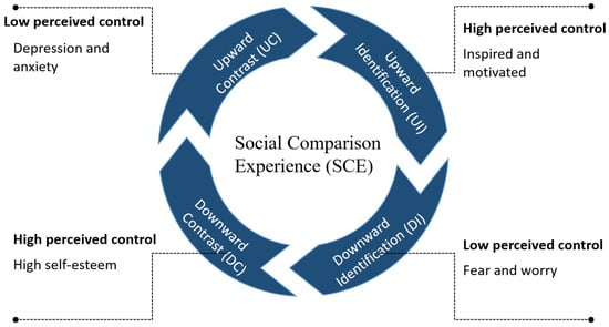 Many studies argue that social media use influences social comparison, which subsequently has a negative impact on SWB [12,13]. They suggest that individuals tend to compare themselves to those who appear to perform better, leading to lowered self-evaluation, feelings of envy, and a decline in overall mood. However, focusing solely on upward contrast has certain limitations. Given the diverse forms of interaction on social media, users may not only experience upward contrast but may also engage in other types of social comparison. Additionally, early studies simply associated upward contrast with negative emotions and downward comparison with positive emotions, overlooking situations where both types could simultaneously evoke both positive and negative emotions [14]. This is because perceived control can also serve as an additional dimension in differentiating social comparisons [15]; that is, even within the same direction for comparison, the level of control individuals feel in narrowing the gap with their comparison targets can influence the outcome of the comparison. For example, when college students see others achieving outstanding academic results on RED, if they believe they can attain similar achievements through effort, their self-identity is likely to strengthen; conversely, if they feel unable to achieve those results despite their best efforts, it may increase their risk of depression [16]. Therefore, when applying a social comparison framework, beyond categorizing comparison targets into upward (others who are superior) and downward (others who are inferior), social comparison outcomes should be further refined into two dimensions: identification and contrast. In other words, upward social comparison experiences can be divided into upward identification and upward contrast, while downward social comparison experiences can be divided into downward identification and downward contrast, thus resulting in four distinct types.