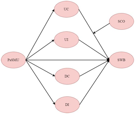 A substantial body of empirical research has investigated the impact of social media usage on subjective well-being (SWB) of college students; however, these studies have not yet reached consistent conclusions [2]. On the one hand, accurately assessing this concept is challenging due to significant differences in how social media usage is defined. For example, measuring social media usage by time or frequency has limitations, as people often find it difficult to accurately report frequency or duration [5]. Additionally, time-based measurements may introduce the issue of the displacement hypothesis, limiting engagement in other activities beneficial to well-being [6]. This has led more researchers to recognize that the impact of social media on SWB largely depends on users’ engagement style and the specific content they encounter rather than merely on duration or frequency [7]. To address this issue, Burke et al. [8] proposed the active–passive social media use (ASMU-PaSMU) dichotomy. Passive social media use (PaSMU) refers to instances where users acquire information without engaging in interactions, such as browsing and viewing others’ content [9]. Verduyn et al. [10] found that PaSMU is negatively correlated with SWB, with a more pronounced and stable impact compared to active use. Meier and Krause [11] noted that due to the complexity of how social media influences users, introducing mediating and moderating variables is essential for deeper analysis.