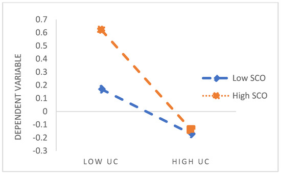 Following the recommendations of Cohen et al. [48] regarding the interpretation of the moderating effects of two predictor variables on the dependent variable, we plotted the interaction between upward contrast and SWB (Figure 3). The results indicate that individuals in the high-SCO group experience a significant decrease in SWB when engaging in upward contrast compared to those in the low-SCO group. Therefore, SCO clearly serves as an amplifying moderator between upward contrast and SWB.