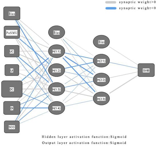 In investigating the impact of PaSMU on the SWB of college students, traditional linear methods such as multiple regression analysis (MRA) and SEM are effective for linear relationships. However, given that this study includes four mediating variables and one moderating variable, these methods have limitations. To address the constraints of linear assumptions, this research is based on SEM and introduced multilayer perceptron (MLP), which is a specific type of artificial neural network (ANN), creating a more precise predictive framework. Unlike traditional linear approaches, ANN can identify nonlinear and non-compensatory relationships [47]. With a two-stage hybrid SEM-ANN approach, this study captures the complex relationship between PaSMU and SWB more effectively, enhancing predictive capability and providing rigorous empirical support for understanding the factors influencing the mental health of college students.