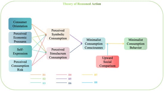 Although existing research has focused on Millennials’ consumer behavior and intergenerational characteristics, there is currently limited systematic discussion combining symbolic consumption, simulacrum consumption, and minimalist consumption behavior [,]. Using the Theory of Reasoned Action as a framework, this study analyzes multiple factors that may influence symbolic and simulacrum consumption perceptions, discusses how these two consumption perceptions affect minimalist consumption consciousness, and examines the process of transforming minimalist consumption consciousness into behavior. The Theory of Reasoned Action suggests that individuals make choices in the behavioral decision-making process based on expectations of behavioral outcomes, attitudes, social norms, and behavioral intentions. With this theoretical framework, this study’s analysis considers the following four key dimensions. Consumption orientation is a significant factor influencing symbolic and simulacrum consumption perceptions, reflecting consumers’ focus on the symbolic meaning and simulacrum value behind goods, transcending their actual functional value. Meanwhile, analysis of perceived economic pressures, as an external environmental factor, can reveal how economic downturns intensify consumers’ cognitive need for symbolic and simulacrum consumption. In addition, self-expression plays a crucial role in consumer behavior, and an enhancement in self-expression ability prompts consumers to choose products they genuinely need rather than homogenized symbolic or simulacrum products. Finally, perceived consumption risk reflects consumers’ weighing of potential benefits and risks in decision making regarding symbolic or simulacrum consumption. These variables collectively construct the causal pathway between consumers’ psychological perceptions and behavioral decisions. To further uncover the role of social factors, this study introduces social comparison as a moderating variable, exploring how comparison with others (especially those in higher social strata) influences consumers’ transformation from minimalist consumption consciousness to minimalist consumption behavior.