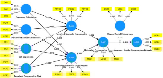 This study used Smart PLS 4.0 statistical analysis software to test the collected data using partial least squares structural equation modeling (PLS-SEM). Partial least squares is a multivariate statistical data analysis method that finds the best functional match for a set of data by minimizing the square of the error. It can model the regression of multiple dependent variables on multiple independent variables. In PLS analysis, the test of the structural model includes the estimation of path coefficients and the values of R2 and Q2. Path coefficients reflect the direction and degree of influence between latent variables. The R2 value reflects the degree to which endogenous latent variables in the structural model can be explained by exogenous latent variables and also reflects the explanatory power of the model. Q2 is the correlation between predicted manifest variables. In accordance with the theoretical model constructed in this chapter, in order to verify the model and hypotheses proposed in this study, we used the visual Smart PLS 4.0 to perform PLS analysis and the Bootstrapping sampling method to calculate the significance of the path coefficients in the constructed model (as shown in Figure 3). As can be seen in Table 6, the R2 values of simulacrum consumption perception, minimalist consumption awareness, minimalist consumption behaviors, and symbolic consumption perception are 0.640, 0.467, 0.610, and 0.556, respectively, indicating moderate explanatory power; the Q2 values are 0.535, 0.364, 0.484, and 0.427, respectively, all of which are greater than zero, indicating positive predictive power.