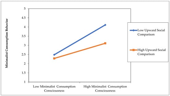 Upward social comparison of minimalist consumption awareness via minimalist consumption behavior (β = −0.187, p < 0.05) has a significant negative impact, indicating that upward social comparison has a negative moderating effect between minimalist consumption awareness and minimalist consumption behavior. The hypothesis is established, and the moderating effect is shown in Figure 4.