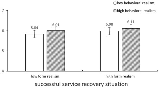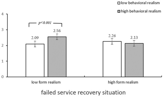 The main effect of service recovery situations is significant (F (1,379) = 3153.88, p < 0.001), i.e., the satisfaction from a successful service recovery (M = 5.99, SD = 0.05) was higher than that from a failed service recovery (M = 2.26, SD = 0.05). The interaction among the service scenario, form realism, and behavioral realism was also significant (F (1,379) = 4.48, p < 0.05) (Figure 2 and Figure 3). Specifically, the results of the simple effect test indicated that under the conditions of failed service recovery, the consumers facing low form realism and high behavioral realism (vs. low behavioral realism) expressed high levels of satisfaction (Mlow behavioral realism = 2.09, Mhigh behavioral realism = 2.56, p < 0.001). Conversely, when the consumers were faced with failed service recovery, high behavioral realism, and high form realism of the AI agents (vs. low form realism), they exhibited low levels of satisfaction (Mhigh form realism = 2.13, Mlow form realism = 2.56, p < 0.01). However, under successful service recovery, the effect of the interaction between form and behavioral realism was not significant.