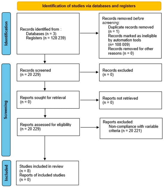- Page, M.J.; McKenzie, J.E.; Bossuyt, P.M.; Boutron, I.; Hoffmann, T.C.; Mulrow, C.D.; Shamseer, L.; Tetzlaff, J.M.; Akl, E.A.; Brennan, S.E.; et al. The PRISMA 2020 statement: An updated guideline for reporting systematic reviews. Syst. Rev. 2021, 10, 89. [Google Scholar] [CrossRef] [PubMed]
