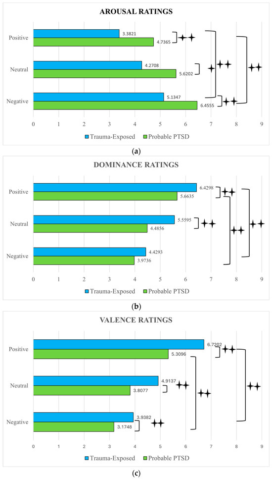 Self-Assessment Manikin arousal, dominance, and valence ratings of Probable PTSD and Trauma-exposed participants separated by image categories (positive, neutral, and negative), with arousal in the top panel (a), dominance in the middle panel (b), and valence in the bottom panel (c). ✦ indicate a statistical significance of ≤0.05. ✦✦ indicate a statistical significance of ≤0.01.