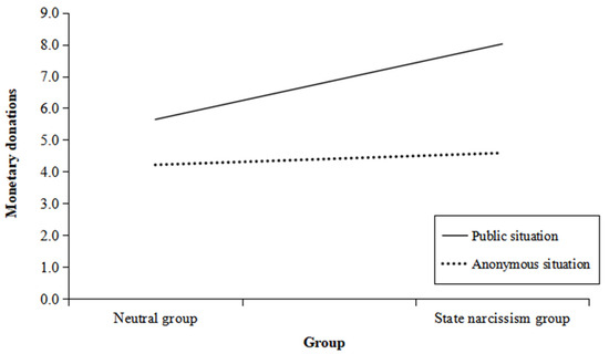 The results also showed that there was a significant main effect of group, B = 1.40, SE = 0.30, 95%CI = [0.82, 1.99], t(196) = 4.71, p < 0.001, indicating that participants in the state narcissism group were more prosocial than participants in the neutral condition. There was also a significant main effect of situation, B = 2.42, SE = 0.30, 95%CI = [1.84, 3.01], t(196) = 8.12, p < 0.001, in which the participants in the public situation made greater donations than those in the anonymous situation.