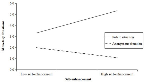 Prosocial behaviors (monetary donations) as a function of situations and self-enhancement of Study 3.