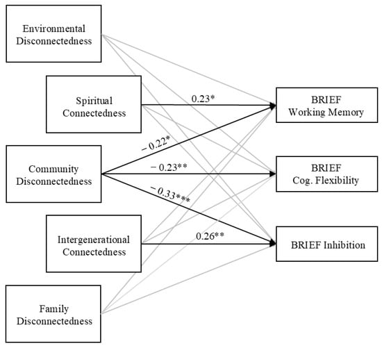 Last, it is important to note that EF skills are closely related, and even direct assessments of EF cannot fully tease apart working memory, inhibition, or cognitive flexibility as separable components. Thus, it is difficult to draw conclusions about why spiritual and intergenerational connectedness were more related to working memory and inhibition, while we did not find significant associations with cognitive flexibility. It is possible the BRIEF did not fully capture enough culturally relevant examples of cognitive flexibility. Examples include playing AI/AN games or children’s dual-language fluency, which may require EF skills such as cognitive flexibility and shifting to a greater extent [,]. Regardless, it is likely children utilized some aspects of cognitive flexibility to accomplish tasks associated with working memory and inhibition on the BRIEF. Future research should work with tribal communities to investigate examples of culturally relevant manifestations of EF to develop more accurate measures.