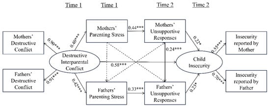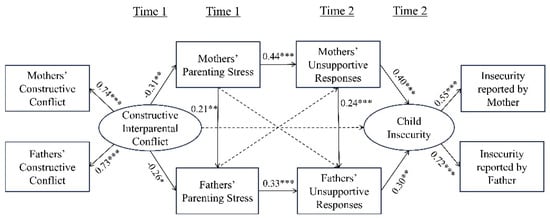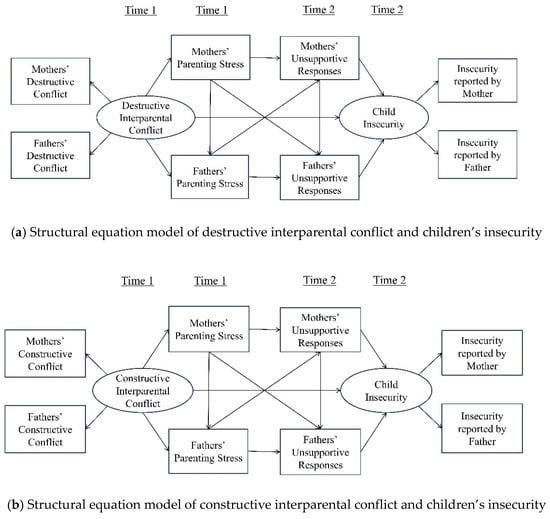 Chicago/Turabian StyleLee, Uiju, and Young-Eun Lee. 2024. "Destructive and Constructive Interparental Conflict, Parenting Stress, Unsupportive Parenting, and Children’s Insecurity: Examining Short-Term Longitudinal Dyadic Spillover and Crossover Process" Behavioral Sciences 14, no. 12: 1212. https://doi.org/10.3390/bs14121212