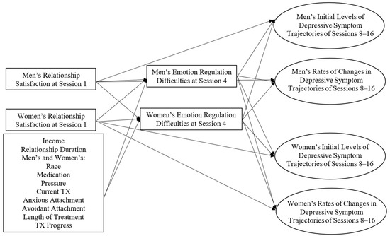 - Notes: Both partners’ treatment progress and length of treatment (sessions 4–8) were the only controls to predict men’s and women’s initial and rates of changes in depressive symptom trajectories. Square boxes represent observed variables. Circles represent latent constructs. Men’s and women’s initial and rates of changes in depressive symptom trajectories are a dyadic latent growth model comprised of observed depressive symptoms at sessions 8, 12, and 16.